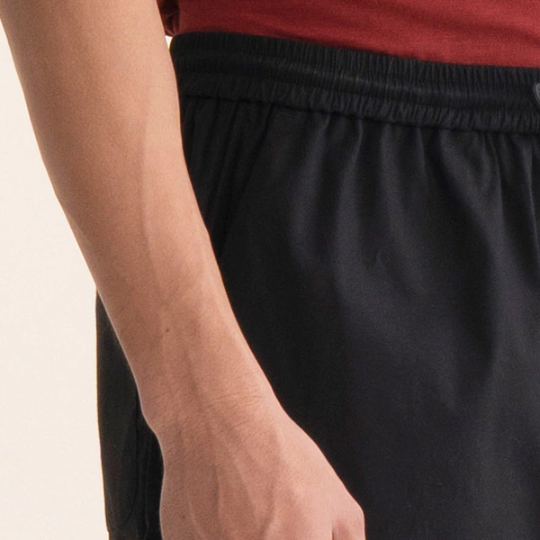 A pair of black mid-rise solid woven lounge shorts, has inner elastic waistband with drawstring closure, 3 pocket Read more