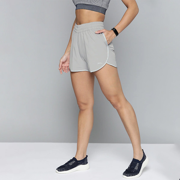 Grey solid mid-rise sports shorts, has 2 pockets, drawstring closure, and mesh lining. Engineered with Ultr-Dry technology. Read more