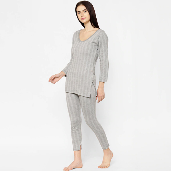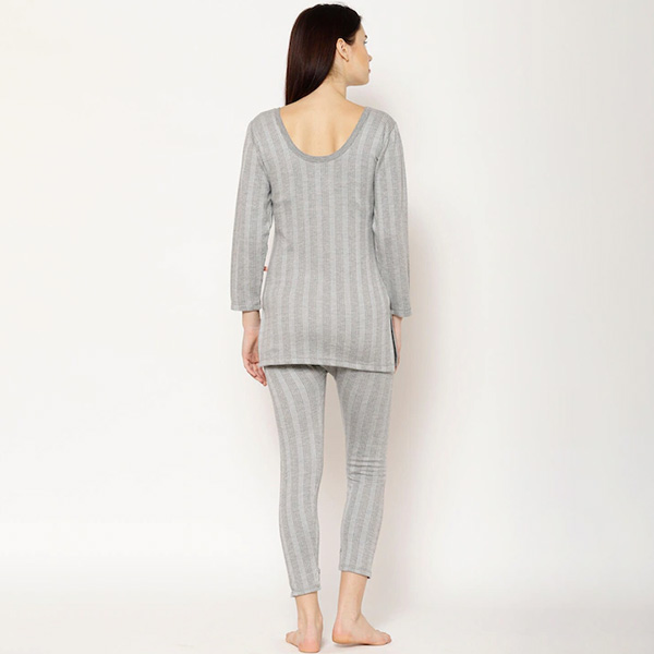 grey striped thermal set consists of a thermal top and thermal bottom Grey striped thermal top, each has round neck, long sleeves, side slits Read more